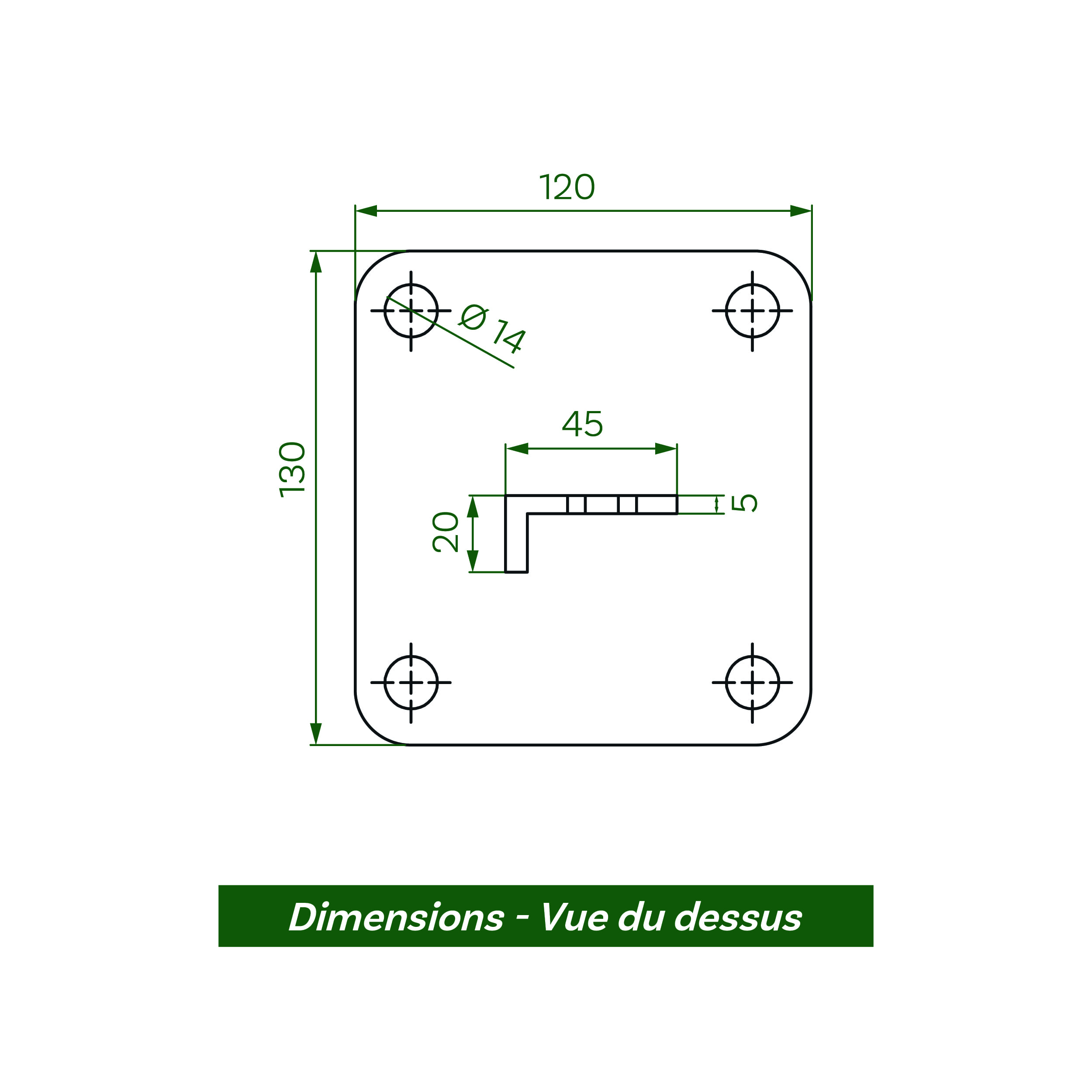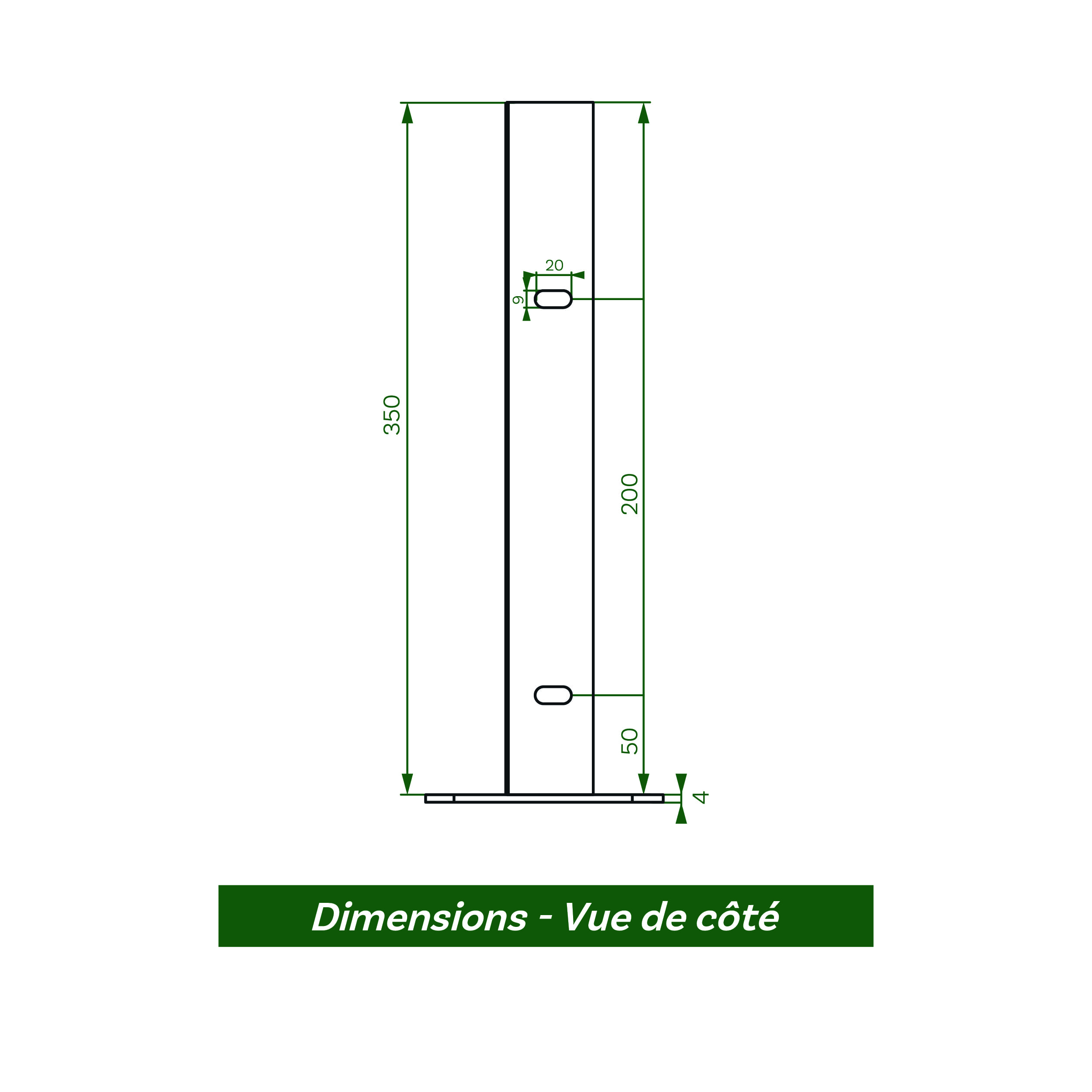 La platine poteau Résid est composée d’une base de 120 x 130 mm perforée à chaque coin. Elle est surmontée d’un montant de 350 mm en forme de L spécialement adapté à la forme de notre poteau Résid à encoches. Le montant est lui aussi perforé de 2 trous de 20 x 9 mm, séparés de 200 mm (entraxe).