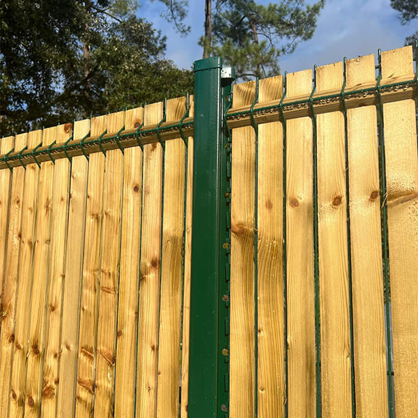 Une fois le premier poteau à encoches scellé ou fixé à sa platine, placez le panneau de manière à aligner son premier fil vertical avec les encoches du poteau. Disposez ensuite le second poteau à 2,545 m du premier (entraxe) puis insérez le dernier fil vertical du panneau dans les encoches. Vous pouvez vous aider de nos cales de fixation pour grillage rigide qui maintiendront le panneau pendant l’installation.
